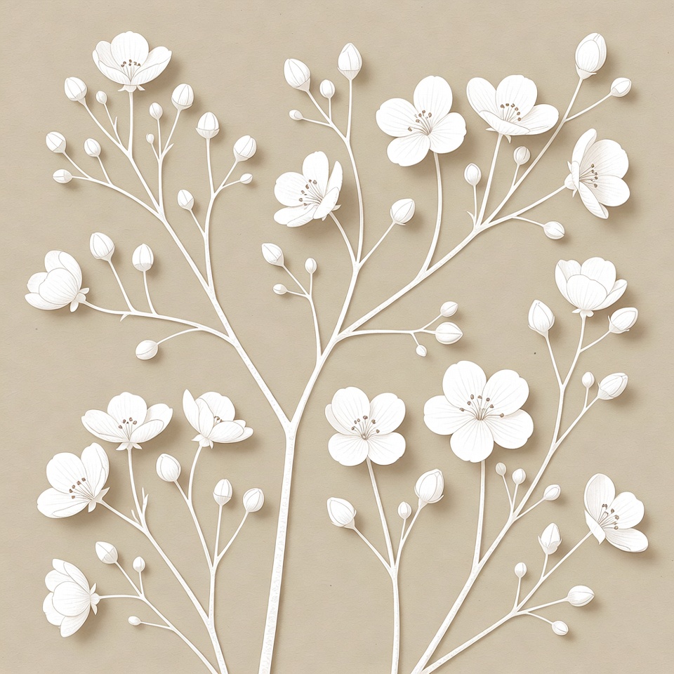 Delicate white paper-cut style blossoms and buds adorn thin branches arranged in a symmetrical pattern. The intricate flowers feature detailed petals and central stamens against a soft beige background. The illustration creates a minimalist, elegant floral design.