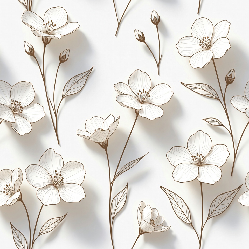 A seamless pattern features delicate white flowers with thin stems and leaves on a white background. The flowers resemble cherry blossoms with multiple petals and small buds. Subtle shadows create a 3D effect in this vector illustration.