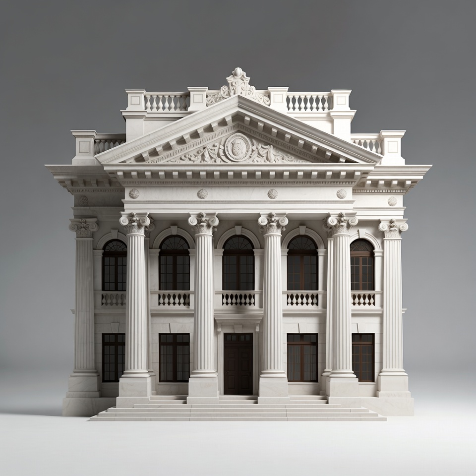 3D render, arched windows, balcony, bank building, classical architecture, columns, facade, government building, grand architecture, historic building, isolated background, luxury architecture, ornate facade, pediment, sculptures, stairs, white building, neoclassical building