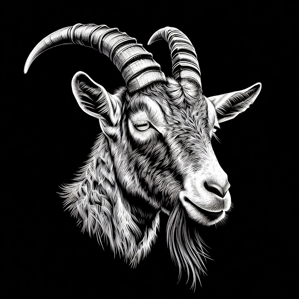 A detailed black and white illustration of a goat's head with large curved horns. The goat has fluffy fur, closed eyes, and a calm expression. It is depicted against an isolated black background.