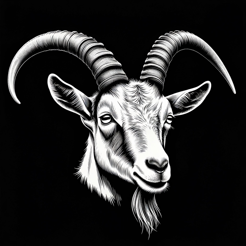 A detailed black and white illustration of a goat's head with large curved horns. The goat faces forward with expressive eyes and a beard under its chin. It is set against a solid black background.