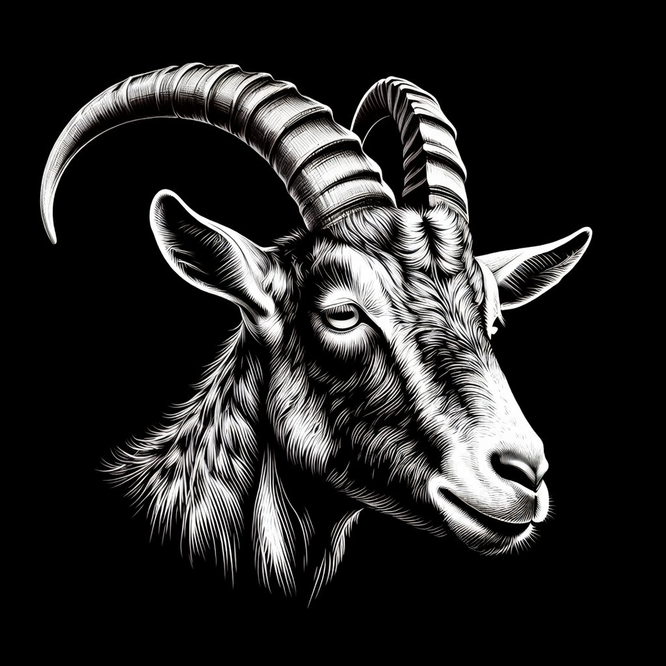 animal portrait, black and white, curved horns, detailed drawing, engraving style, farm animal, fluffy fur, goat head, horns, illustration, ink drawing, isolated background, line art, livestock, pen sketch, profile view, wildlife art, goat