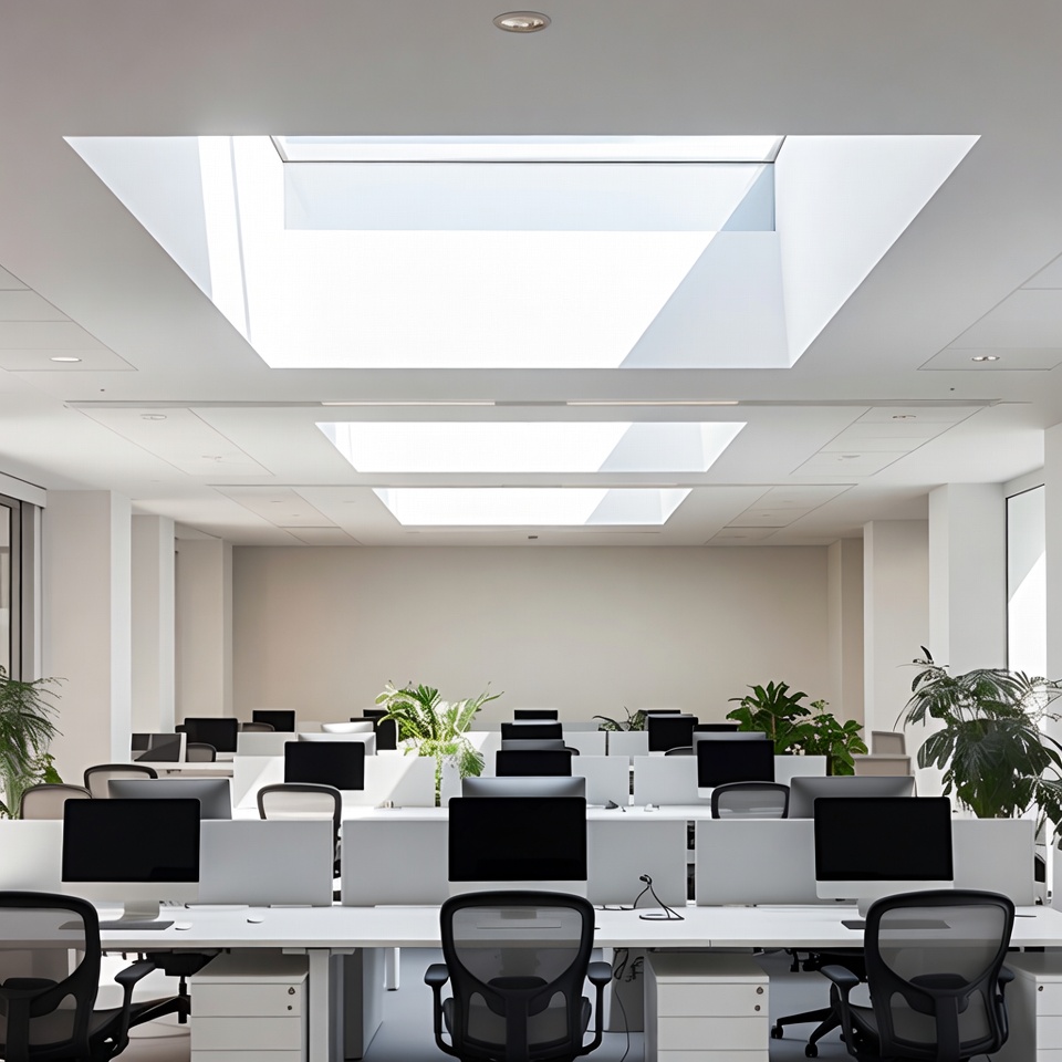 A spacious modern office features rows of white desks and black office chairs arranged neatly. Large skylights in the ceiling allow natural daylight to flood the room. Potted green plants are placed around the workstations against a minimalist white interior.