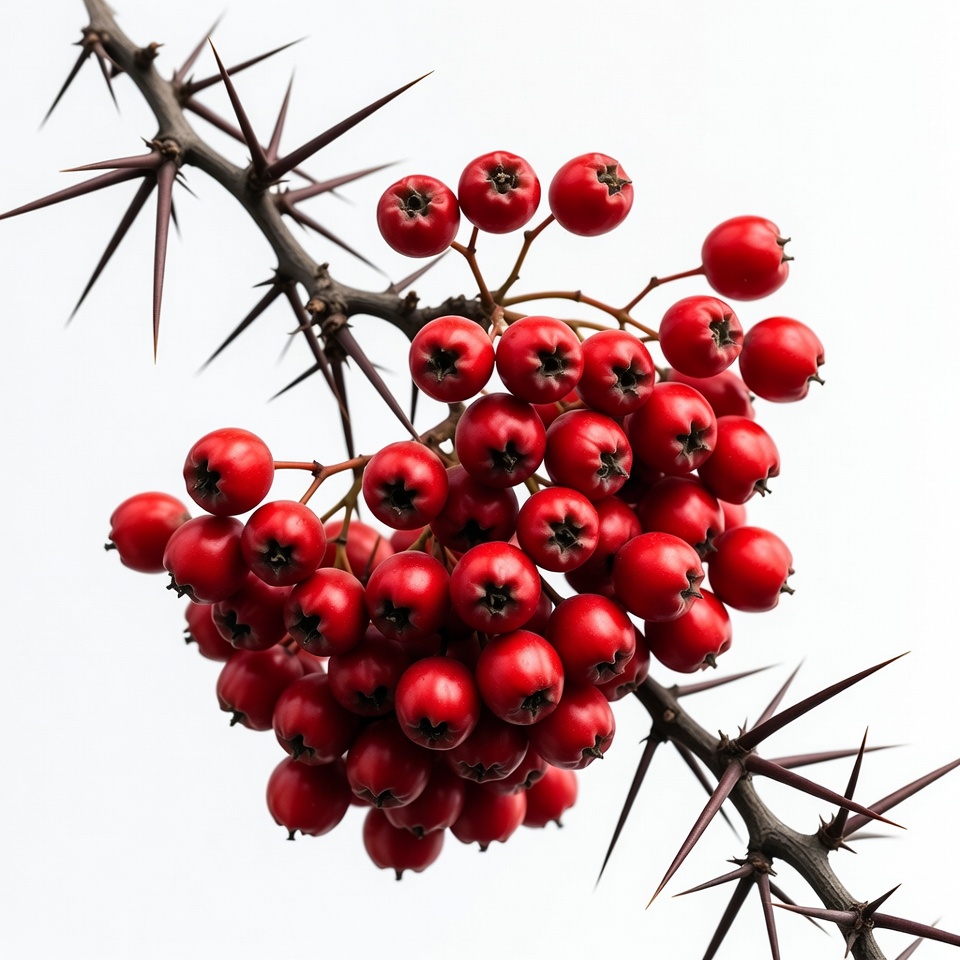 A cluster of bright red berries grows on a thorny branch with sharp black thorns. The berries are round and numerous, arranged in dense bunches. The image is isolated against a white background.