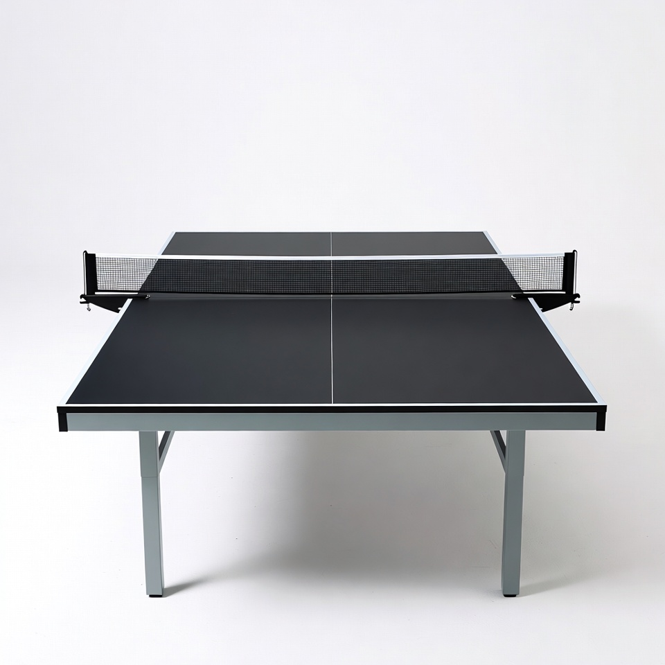 black table, competition table, foldable table, game table, gym equipment, indoor sport, isolated, net, racketless, recreation, silver legs, sports equipment, table tennis, white background, ping pong table