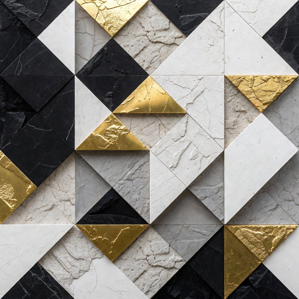 3D effect, angular pattern, art design, background texture, black tiles, contrast colors, cracked texture, decorative tiles, geometric triangles, gold accents, graphic design, isolated background, layered tiles, luxury texture, metallic gold, minimalist art, modern design, monochrome gold, sharp angles, textured surface, tile mosaic, triangular shapes, wall tiles, white tiles, abstract pattern