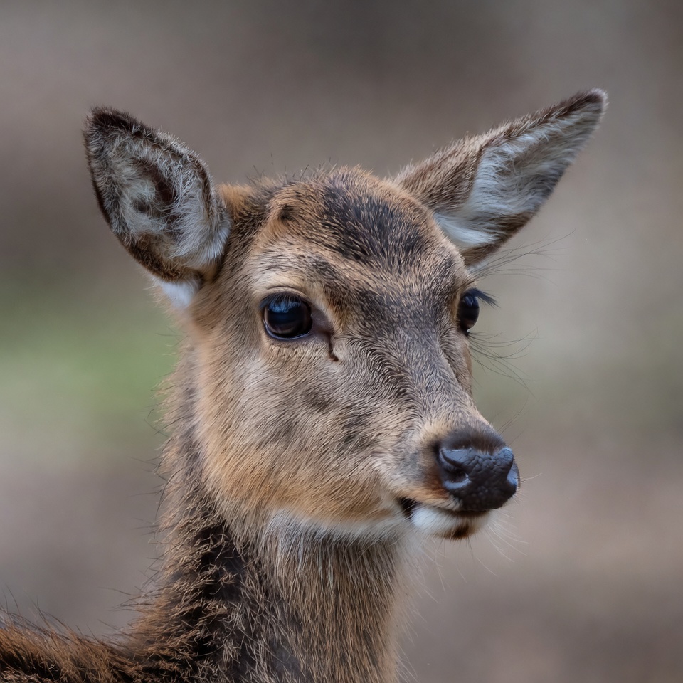animal, brown fur, close-up, cute deer, dark eyes, doe, fawn, forest background, headshot, isolated background, large ears, muzzle, nature, nose, portrait, wild animal, wildlife, young deer, deer