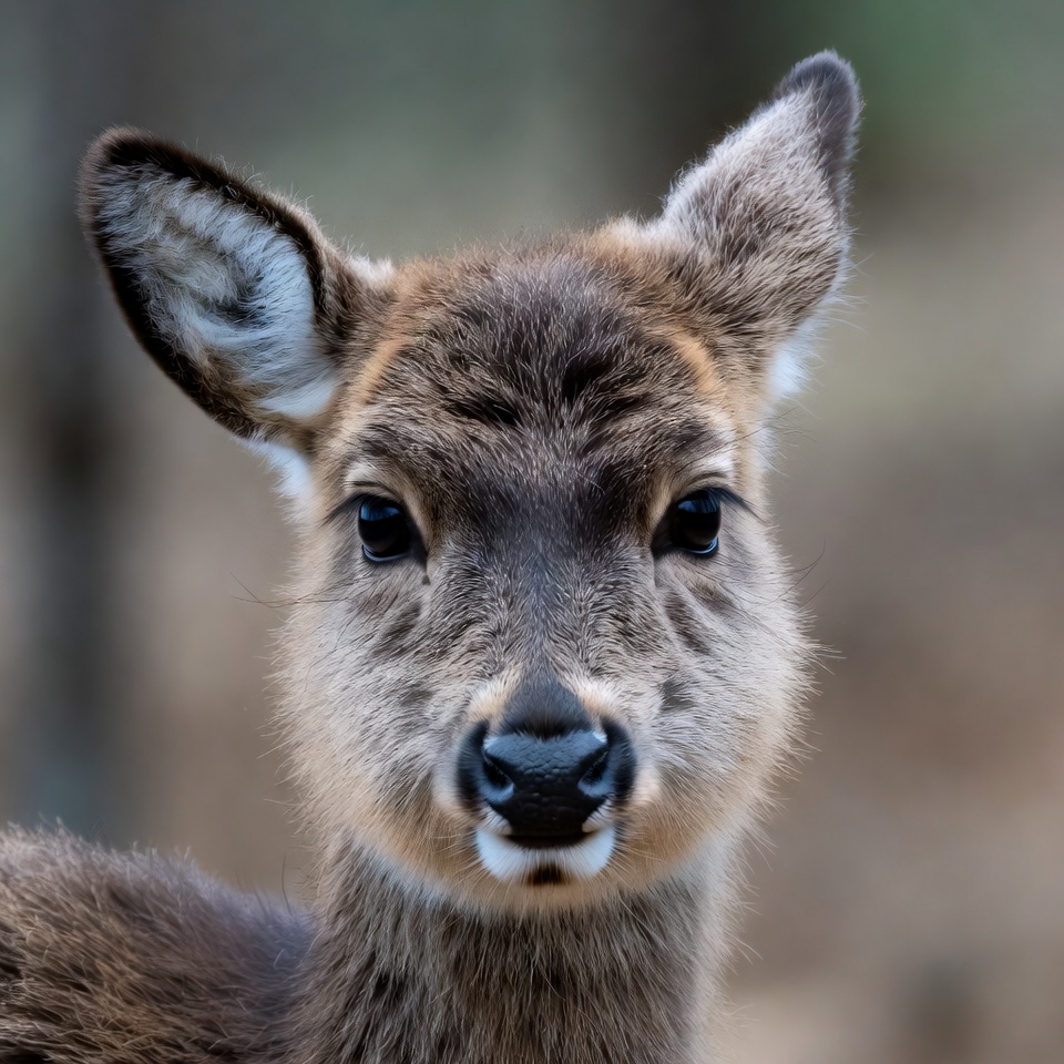 animal, baby deer, brown fur, close-up, cute animal, dark eyes, deer, doe fawn, forest, large ears, nature, portrait, spotted fawn, wildlife, woods, young deer, fawn