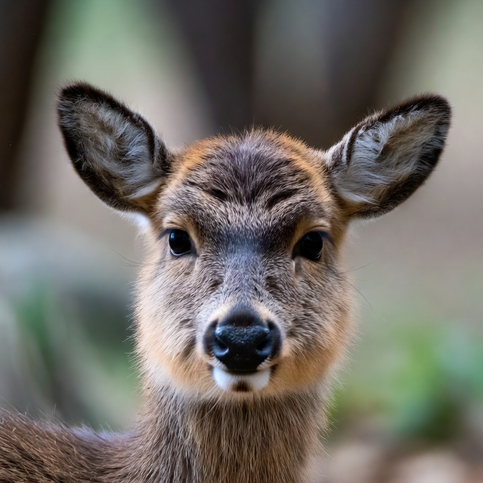 A young fawn with large ears and spotted fur stands in a blurred forest background. Its big dark eyes gaze forward with a gentle expression. Soft brown and white fur covers its face and neck.