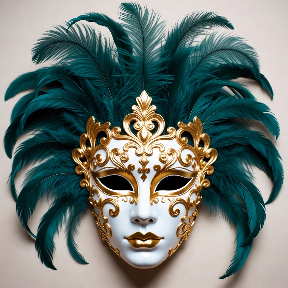 carnival mask, clipart, decorative mask, feathers, filigree design, gold mask, illustration, isolated background, luxury mask, masquerade mask, ornate mask, red lips, teal feathers, white face, Venetian mask