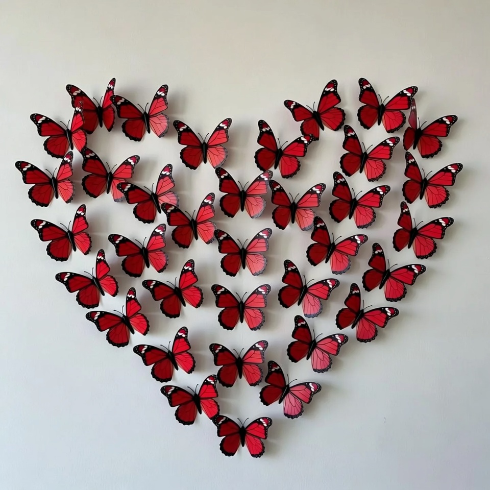 3D effect, black wings, butterflies heart, butterfly, butterfly decoration, craft, heart design, heart shape, insect art, isolated background, love symbol, paper butterflies, red heart, valentine, vibrant red, wall art, white spots, red butterflies