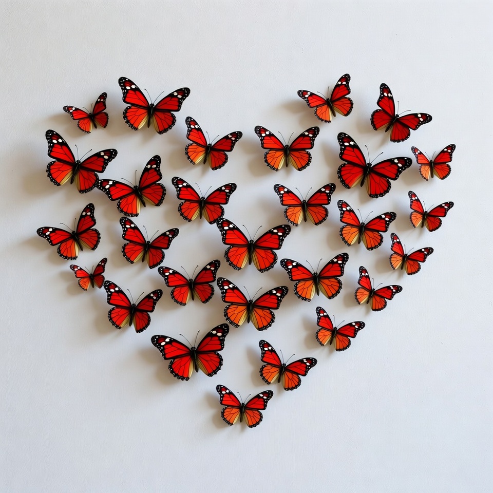 black spots, butterfly arrangement, clipart, decorative, heart, heart shape, illustration, insect art, isolated background, love symbol, monarch butterflies, nature art, orange accents, red butterflies, romantic, symmetrical design, valentine, white background, wings, butterflies