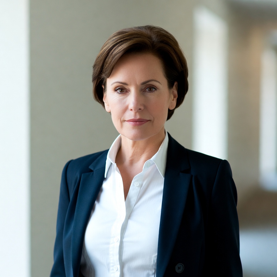 A mature White woman with short brown hair stands confidently in a modern hallway with large windows. She wears a navy blue blazer over a white collared shirt, posing directly at the camera. The background features white walls and bright natural light.