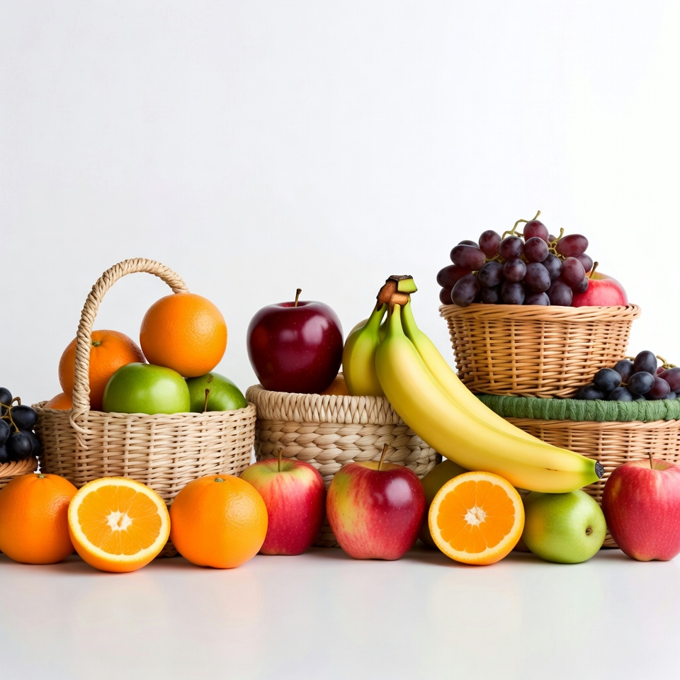apples, bananas, citrus fruits, colorful fruits, fresh fruit, fruit arrangement, fruit display, fruit still life, fruit variety, grapes, green apples, healthy food, juicy fruit, market fruits, oranges, orchard fresh, produce, purple grapes, red apples, ripe bananas, sliced oranges, white background, wicker baskets, woven baskets, fruit basket