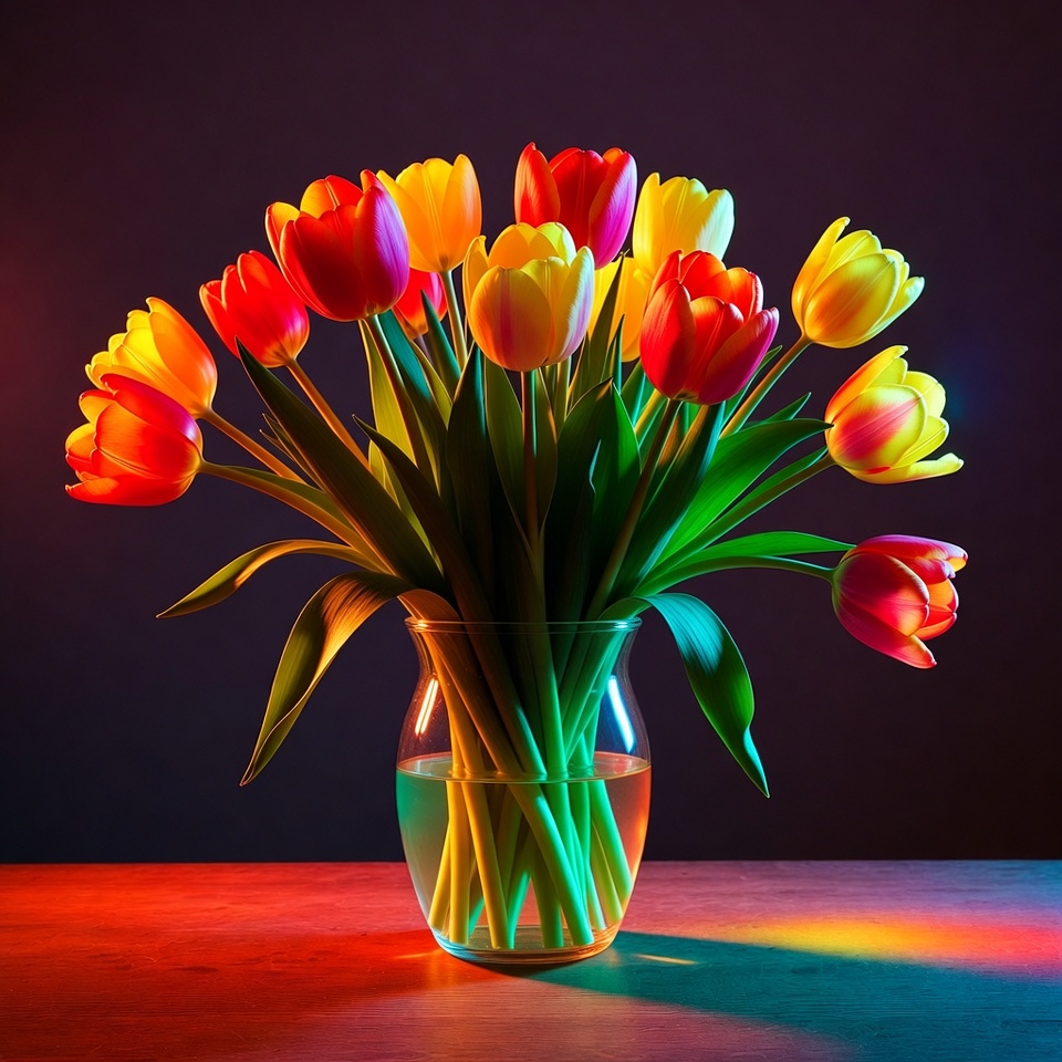 A vibrant bouquet of multicolored tulips in red, yellow, orange, and pink stands in a clear glass vase filled with water. The flowers have long green stems and leaves, arranged on a wooden table. Dramatic lighting creates colorful reflections around the isolated dark background.