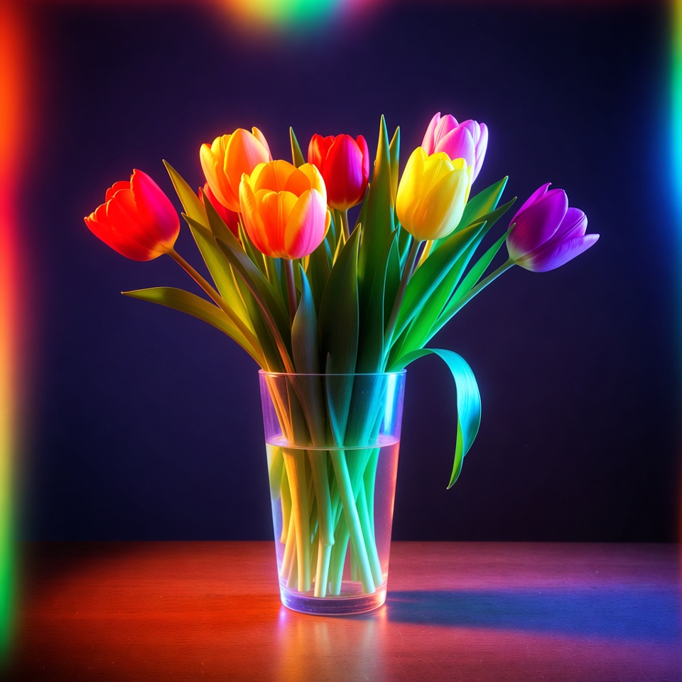 bouquet, colorful flowers, floral arrangement, flower vase, glass vase, green stems, isolated background, multicolor bouquet, neon glow, orange tulips, pink tulips, purple tulips, rainbow lighting, rainbow tulips, red tulips, spring flowers, vibrant colors, wooden table, yellow tulips, tulips