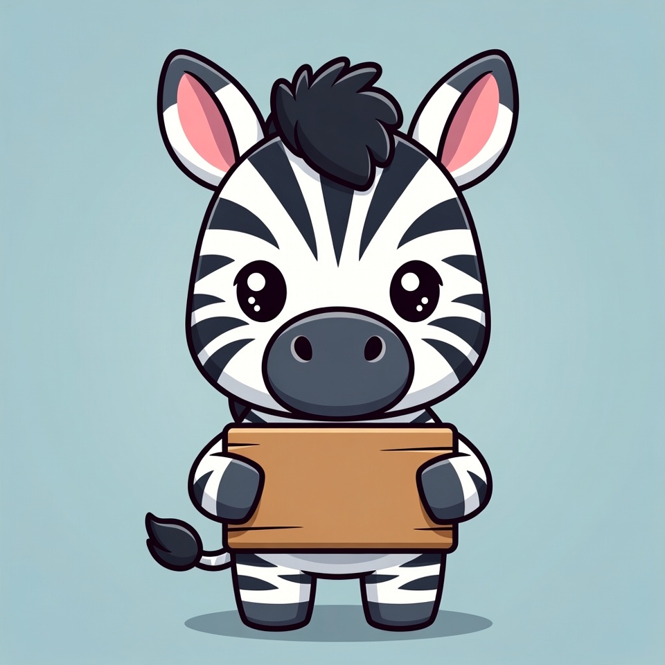 A kawaii-style cartoon zebra with black and white stripes stands on a light blue background. It has large expressive eyes, pink inner ears, and a small black mane. The zebra holds a rectangular brown wooden sign with a blank white surface in its front hooves.