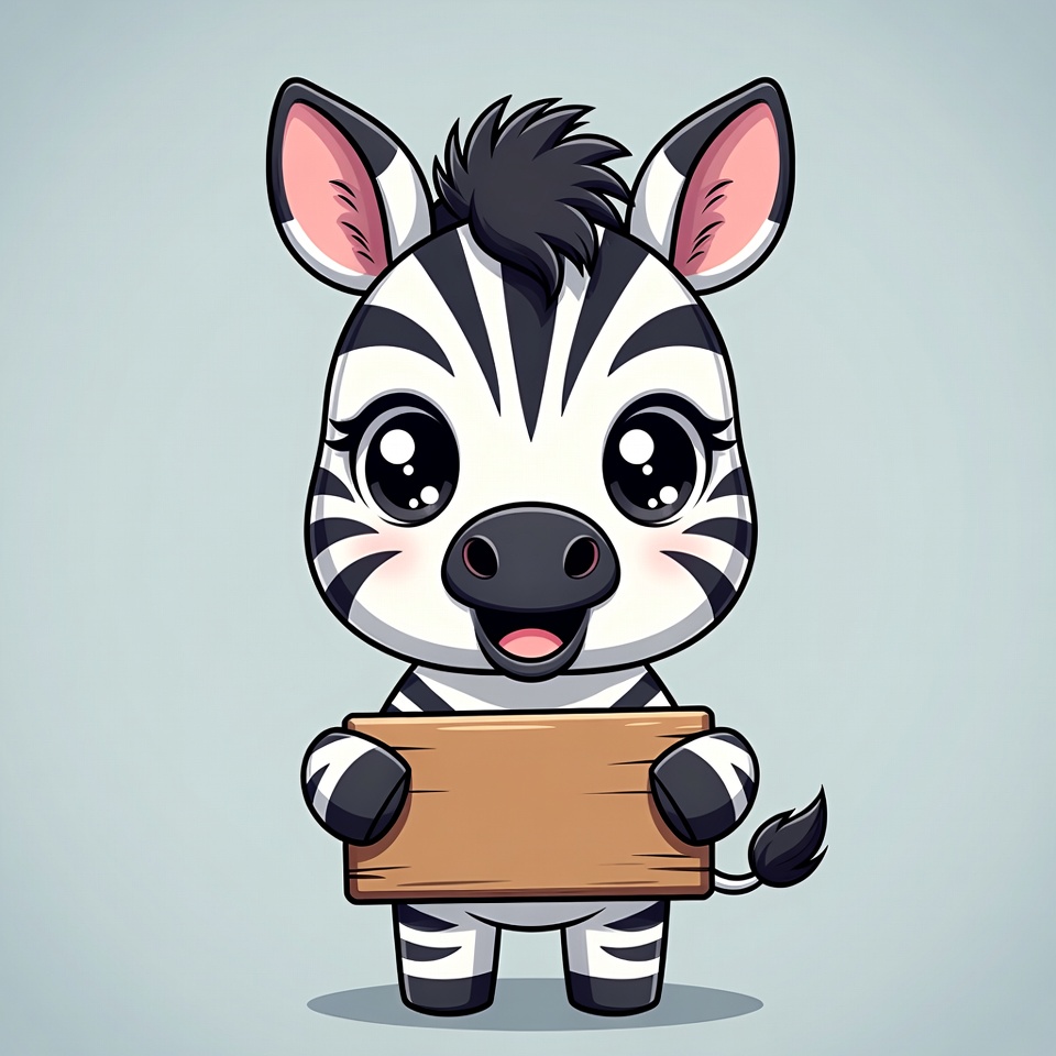 A kawaii-style cartoon zebra with black and white stripes stands on a light blue background. It has large sparkling eyes, a happy smile, and holds a wooden sign with a blank front. The zebra has a fluffy black mane and a small tail.