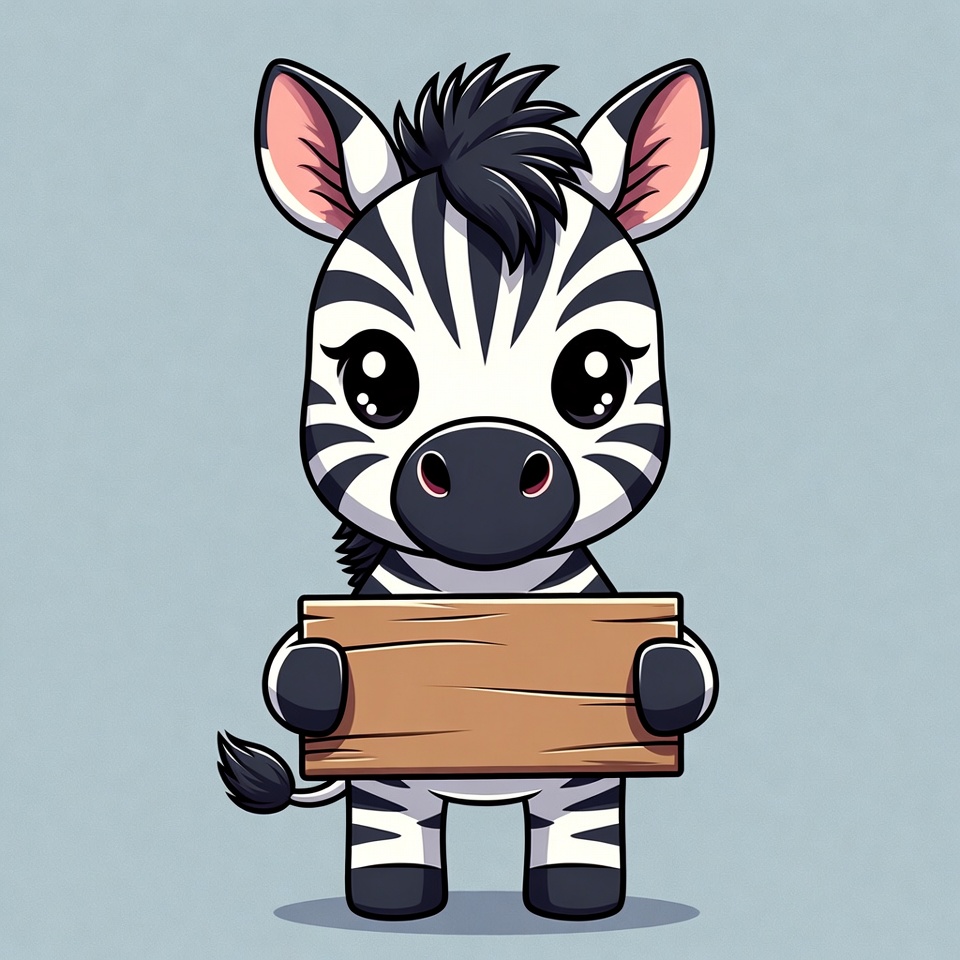A kawaii-style cartoon zebra with black and white stripes stands on a light blue background. The adorable zebra has large sparkling eyes, a fluffy black mane, and holds a rectangular wooden sign with its hooves. Its tail sways behind it, and the sign is blank for text.