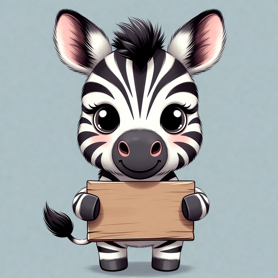 A cute cartoon zebra with big sparkling eyes holds a blank wooden sign in its hooves. The zebra features black and white stripes, pink inner ears, and a fluffy mane on a light blue background. It stands on all fours with a cheerful smile.