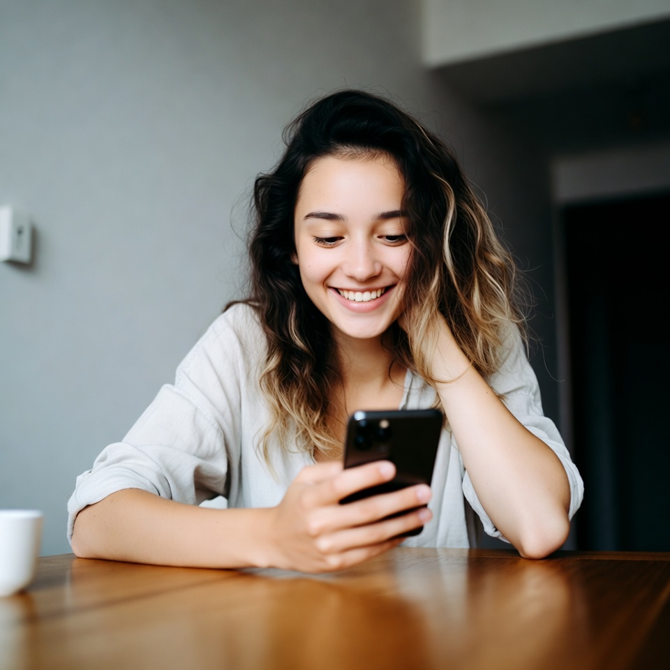 A young woman with wavy dark hair and highlights sits at a wooden table, smiling happily while looking at her smartphone. She wears a light-colored shirt and rests her hand on her cheek. A white cup sits nearby on the table in a modern indoor setting.