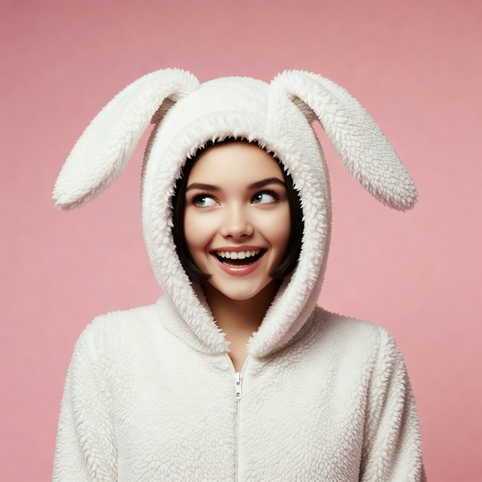 A young Asian woman with dark hair smiles happily while wearing a fluffy white bunny-eared hoodie. She stands against a solid pink background, with the hood's large ears framing her face. Her expression is joyful and playful.