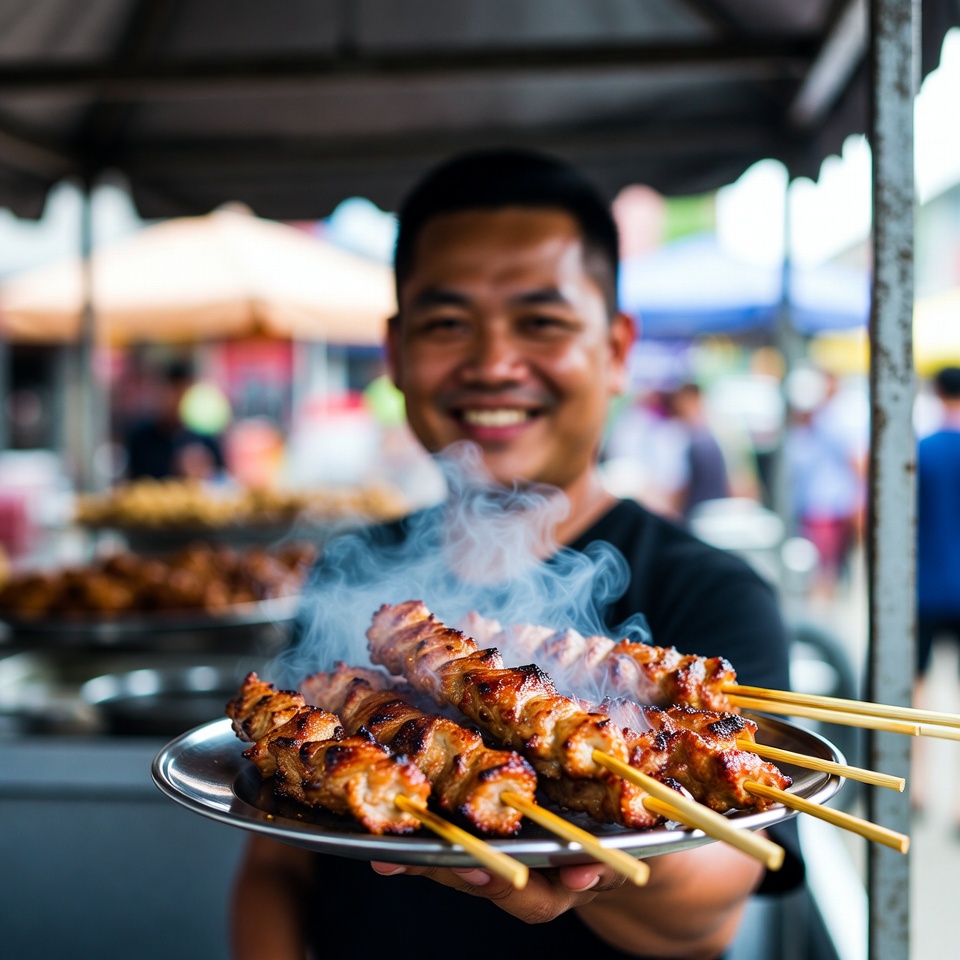 A smiling Asian man in a black shirt holds a large metal plate of steaming grilled satay skewers at a bustling street food market. The skewers are arranged neatly with wooden sticks, and smoke rises from the freshly cooked meat. Blurred market stalls and people are visible in the background under colorful umbrellas.