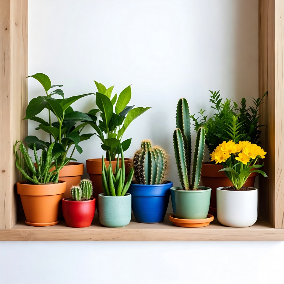 blue pots, cacti, cactus, decorative plants, green plants, green pots, indoor plants, isolated background, leafy plants, plant collection, potted plants, red pots, succulents, terracotta pots, variety plants, white background, white pots, wooden shelf, yellow flowers, houseplants