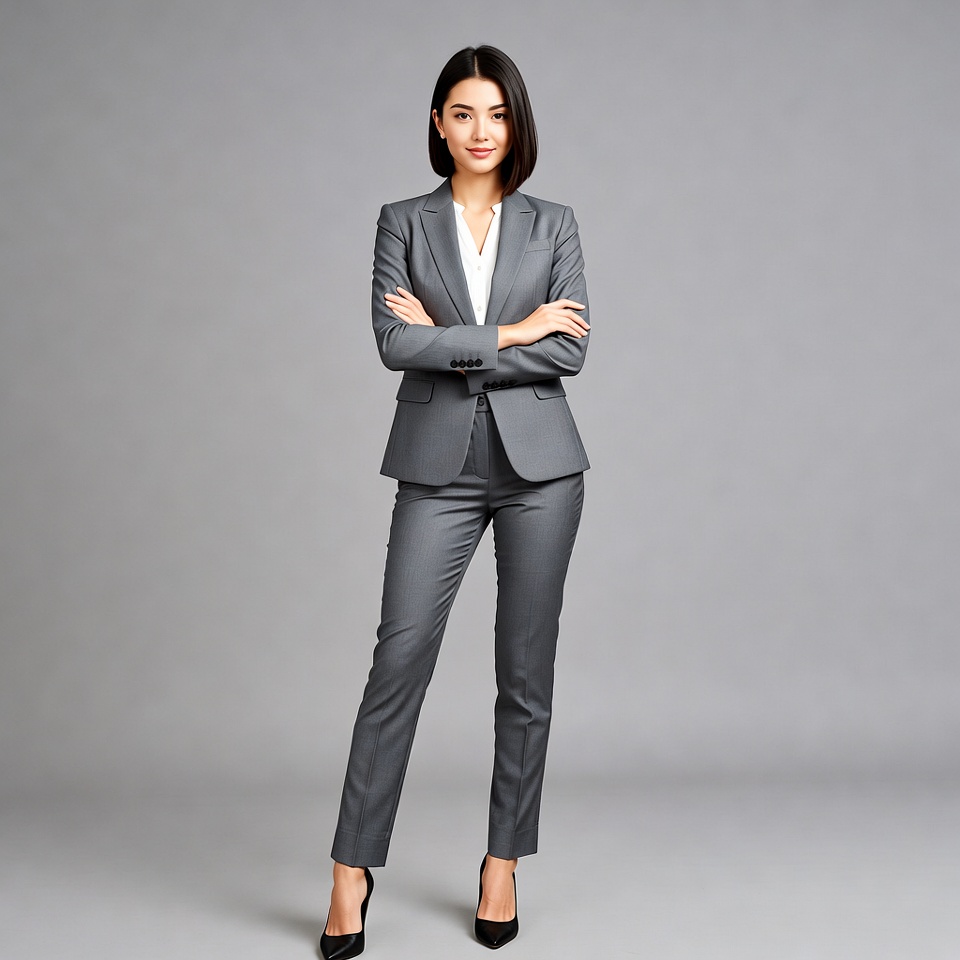 A young Asian woman with short black hair and a confident expression stands with arms crossed against a plain gray background. She wears a tailored gray blazer, matching pants, white blouse, and black high heels. Her professional business attire is sharply fitted.
