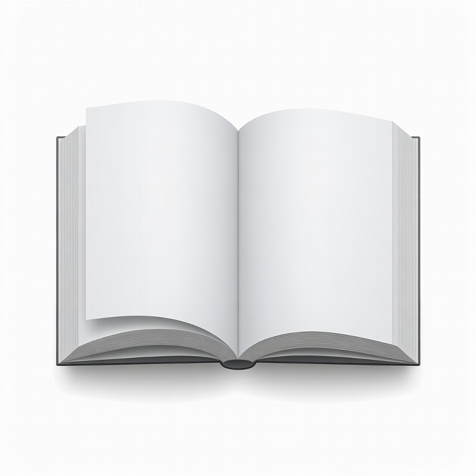 A realistic illustration of an open hardcover book with blank white pages. The book has a dark gray cover and is viewed from above on a plain white isolated background. The pages appear slightly curled at the edges.