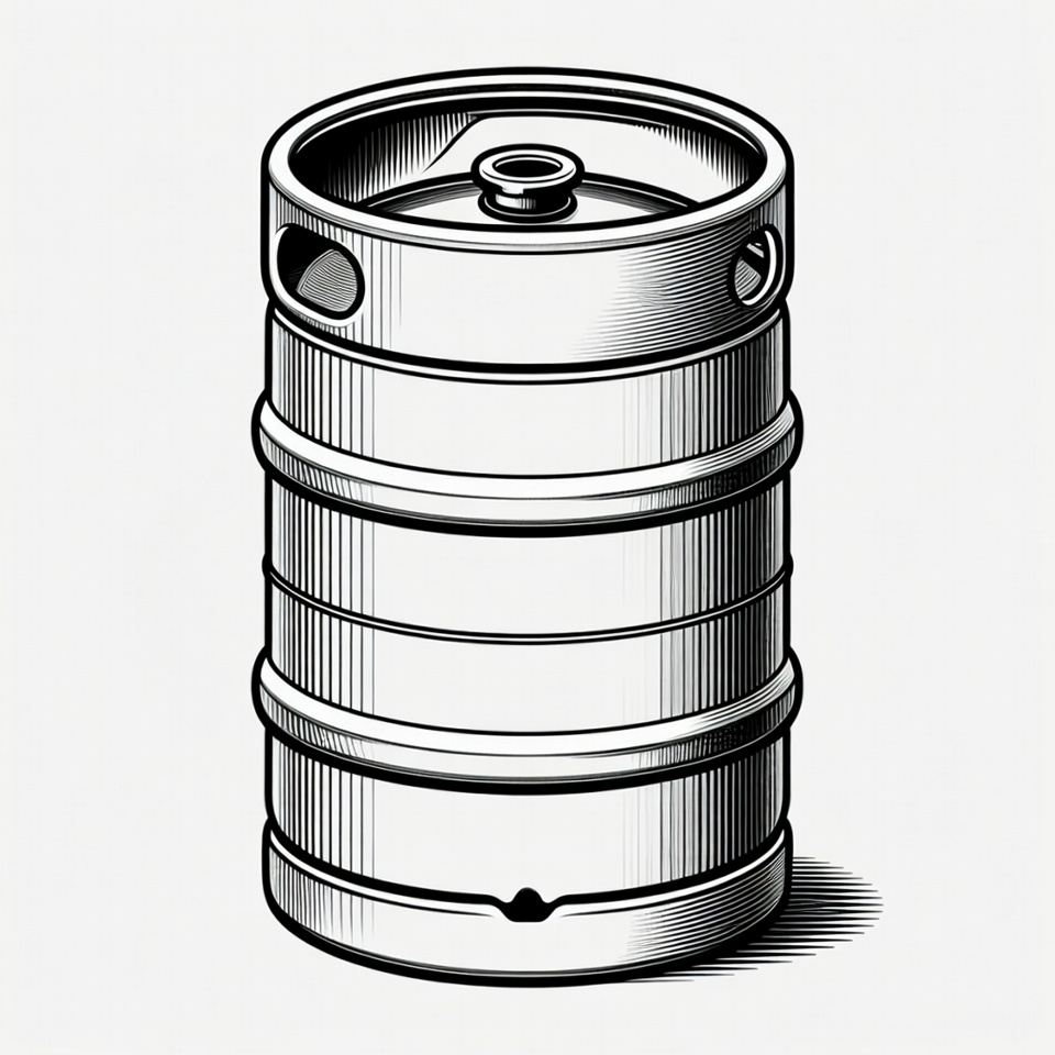 barrel, beer barrel, brewery keg, clipart, draft beer, engraving style, handles, illustration, isolated background, keg, line art, metal keg, silver keg, stainless steel, valve, vector, beer keg