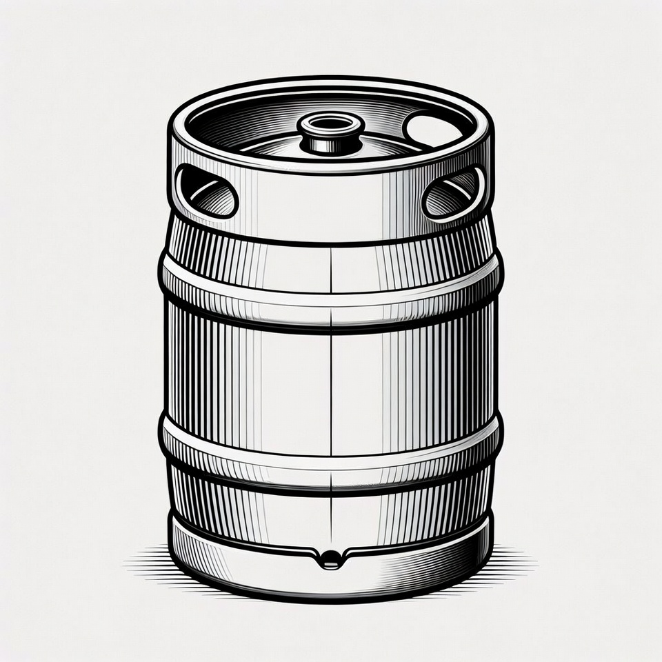 ale keg, barrel, beer barrel, brewery, clipart, draft beer, engraving style, illustration, industrial keg, isolated background, keg, line art, metal keg, vector art, beer keg