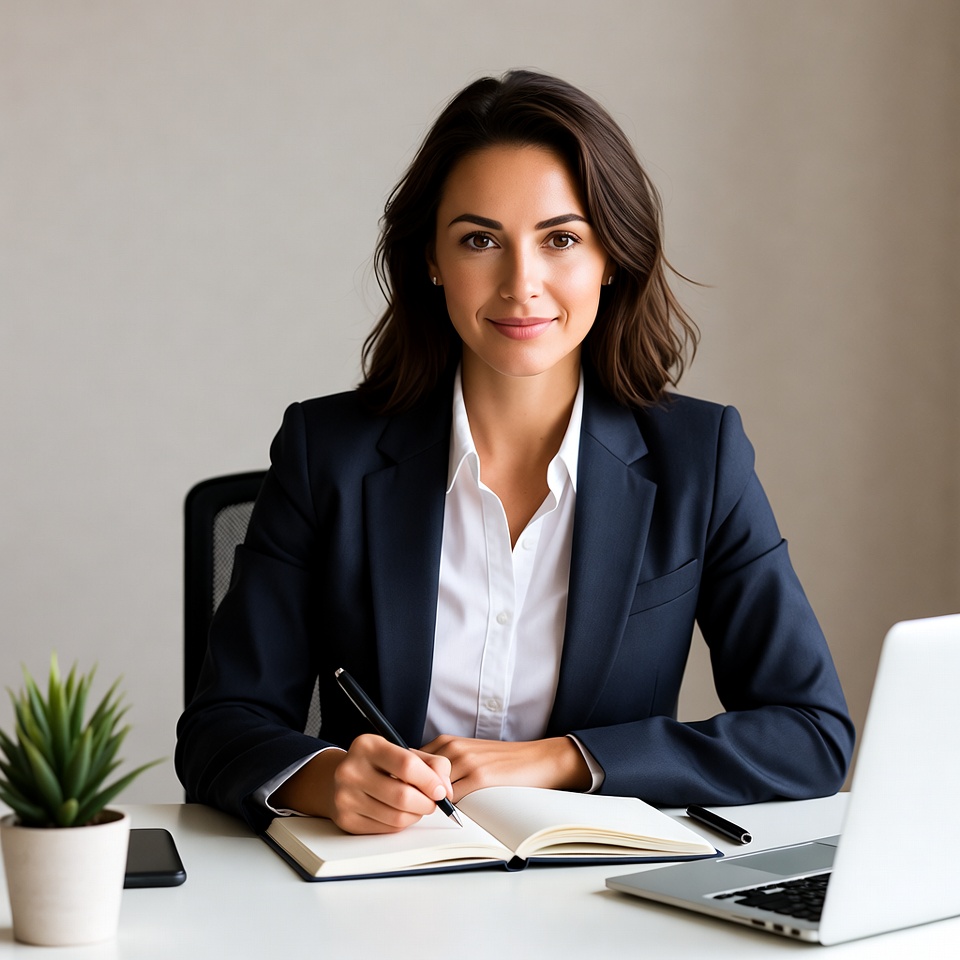A woman with long wavy brown hair sits at a desk wearing a navy blue blazer and white blouse. She holds a pen and writes in an open notebook while a laptop and potted plant sit nearby. She smiles confidently at the camera against a plain background.