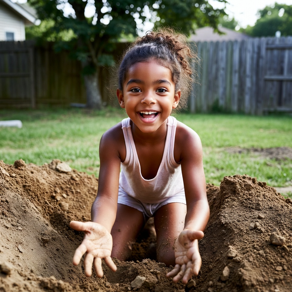 A young African-American girl with curly hair smiles happily while kneeling in a backyard and digging into a pile of dirt with both hands. She wears a light pink tank top and shorts. A wooden fence and trees are visible in the background.