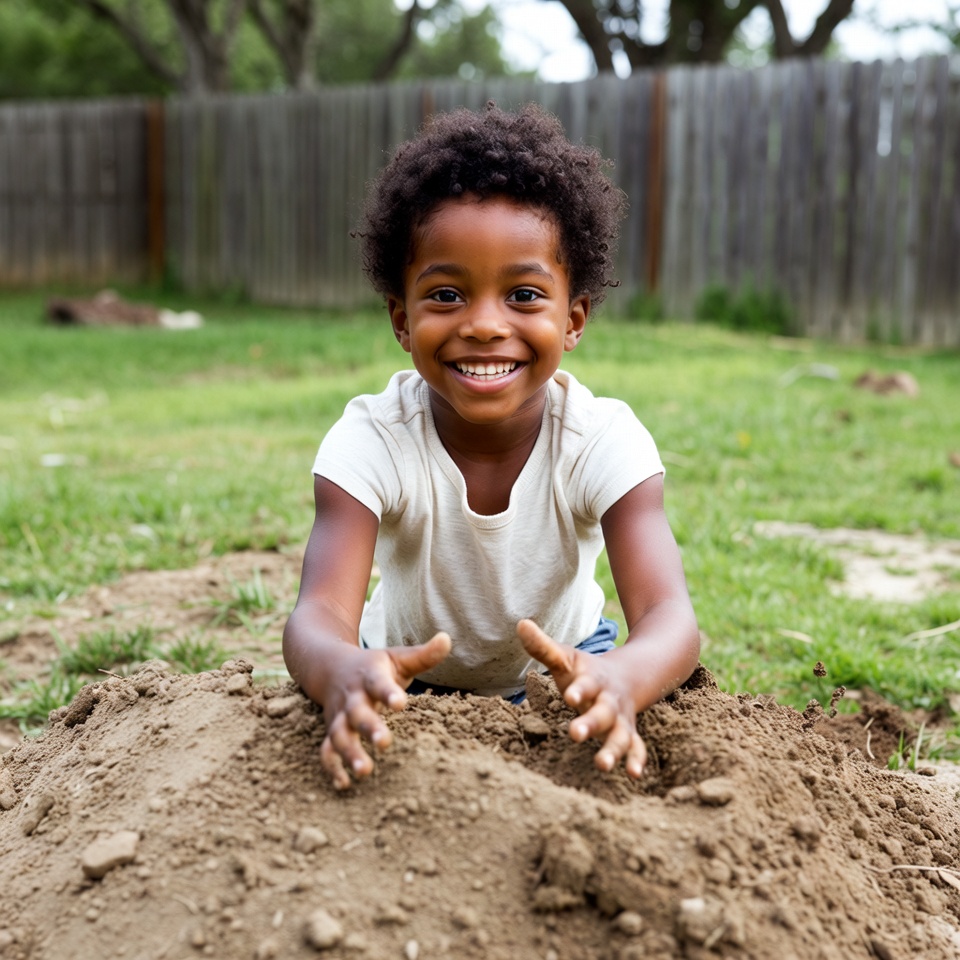 A young African-American boy with curly black hair smiles happily while playing in a pile of dirt in a backyard. He wears a white short-sleeved shirt and squats with hands extended into the soil. A wooden fence and green grass surround him.