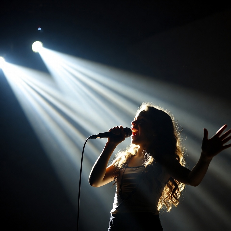 A silhouette of a young woman with long wavy hair sings passionately into a microphone on a dark stage. Bright spotlights beam down on her from above, highlighting her extended hand and white tank top. She stands confidently with a microphone stand in the dramatic lighting.