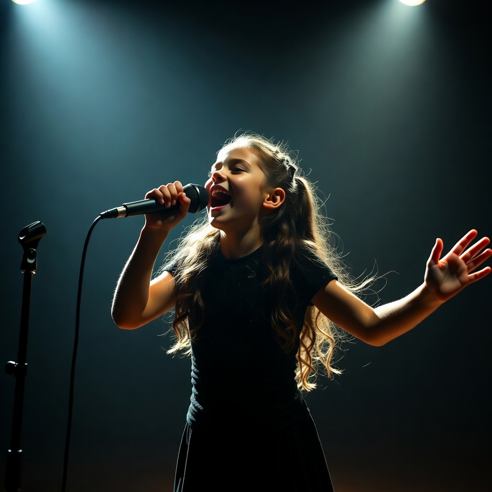arms outstretched, black dress, brown hair, child singer, concert, curly hair, dark background, live performance, microphone, music, passionate singing, performance, pigtails, singing, spotlights, stage, stage lights, vocal, young girl, girl
