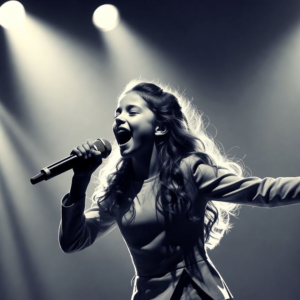 A young girl with long wavy hair sings passionately into a microphone under bright spotlights on a dark stage. She wears a light-colored top and has her arms extended dynamically. The image is in black and white with dramatic lighting highlighting her expressive face.