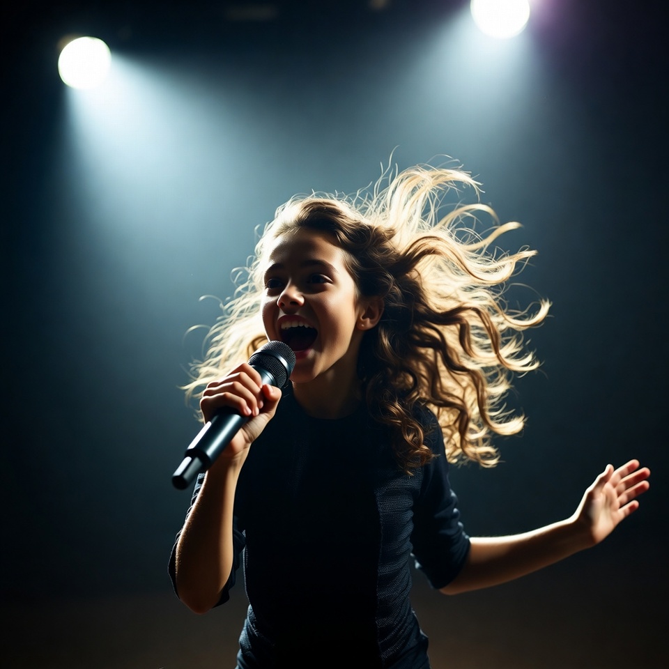 A young girl with long wavy hair sings passionately into a microphone under bright spotlights on a dark stage. She wears a black short-sleeved top and has her arms extended expressively. Her face shows an open-mouthed smile as her hair flows dynamically.