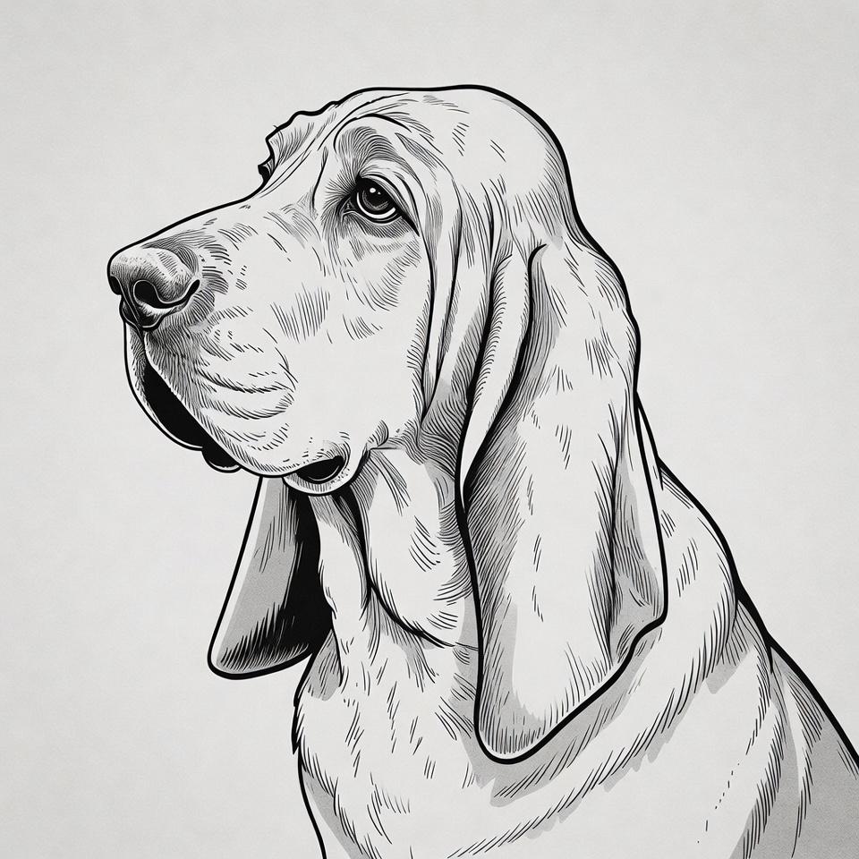 animal, black and white, canine, dog, drawing, droopy eyes, floppy ears, hound dog, illustration, isolated background, line art, long ears, pencil sketch, pet, profile view, side view, sketch, wrinkled face, basset hound