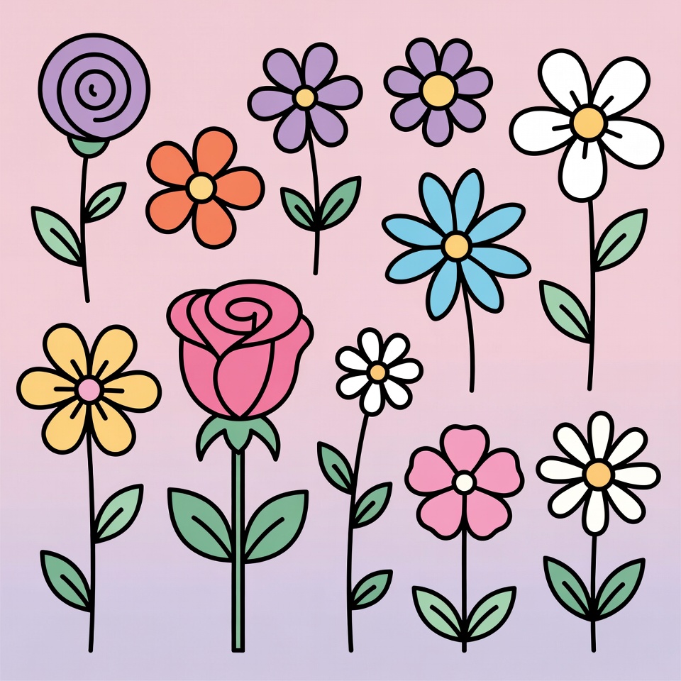 A vibrant collection of illustrated flowers in various colors including pink roses, yellow daisies, purple spirals, blue hydrangeas, orange blooms, and white flowers. Each flower features green stems and leaves, arranged neatly against a soft pink gradient background. The clipart-style drawing showcases diverse flower shapes and petals.