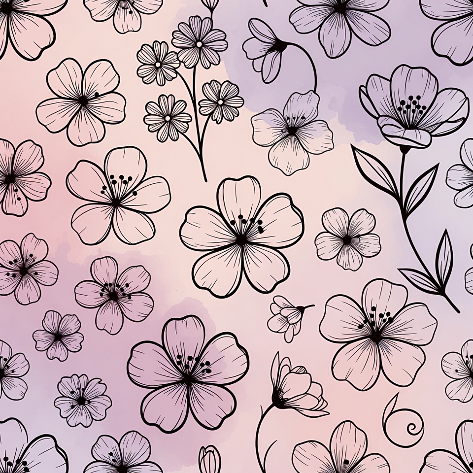 abstract flowers, artistic pattern, blooming flowers, botanical illustration, decorative pattern, delicate flowers, floral design, floral pattern, floral wallpaper, flower art, flower bouquet, flower graphic, flower illustration, flower leaves, flower stems, gradient flowers, hand drawn flowers, ink outline, lavender background, line art flowers, pastel flowers, pink flowers, purple pattern, seamless pattern, soft purple, watercolor art, watercolor background, watercolor flowers, purple flowers