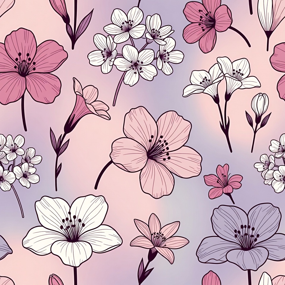A seamless illustration features an arrangement of pink, white, and purple flowers with green stems on a soft pink and purple gradient background. The flowers include hibiscus-like blooms and delicate clusters in various sizes. The design is hand-drawn style clipart suitable for patterns.