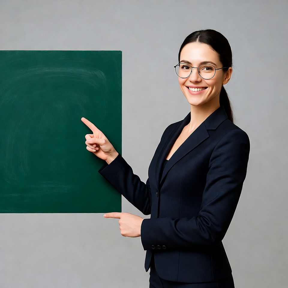 A smiling woman with dark hair in a ponytail and round glasses stands beside a large green chalkboard. She wears a navy blue blazer and points at the board with her right hand extended. The background is plain gray.