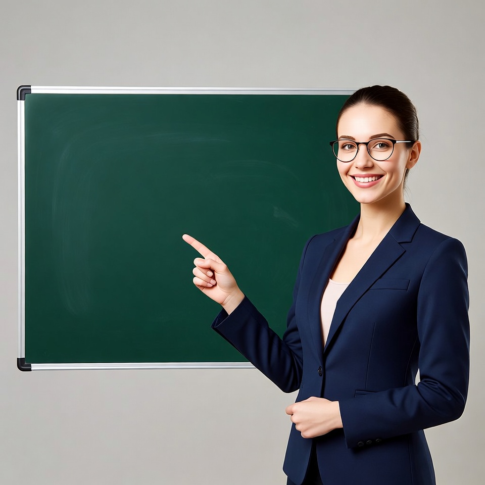 A smiling woman with dark hair in a bun and glasses stands in front of a large green chalkboard. She wears a navy blue blazer over a white blouse and points at the board with her right hand extended. The background is plain and neutral.