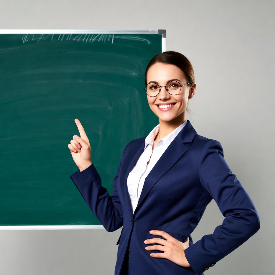 A young woman with dark hair in a ponytail and glasses smiles while pointing at a green whiteboard in a classroom. She wears a white collared shirt under a navy blue blazer and stands confidently with one hand on her hip. The whiteboard has some white chalk marks and is mounted on a light gray wall.