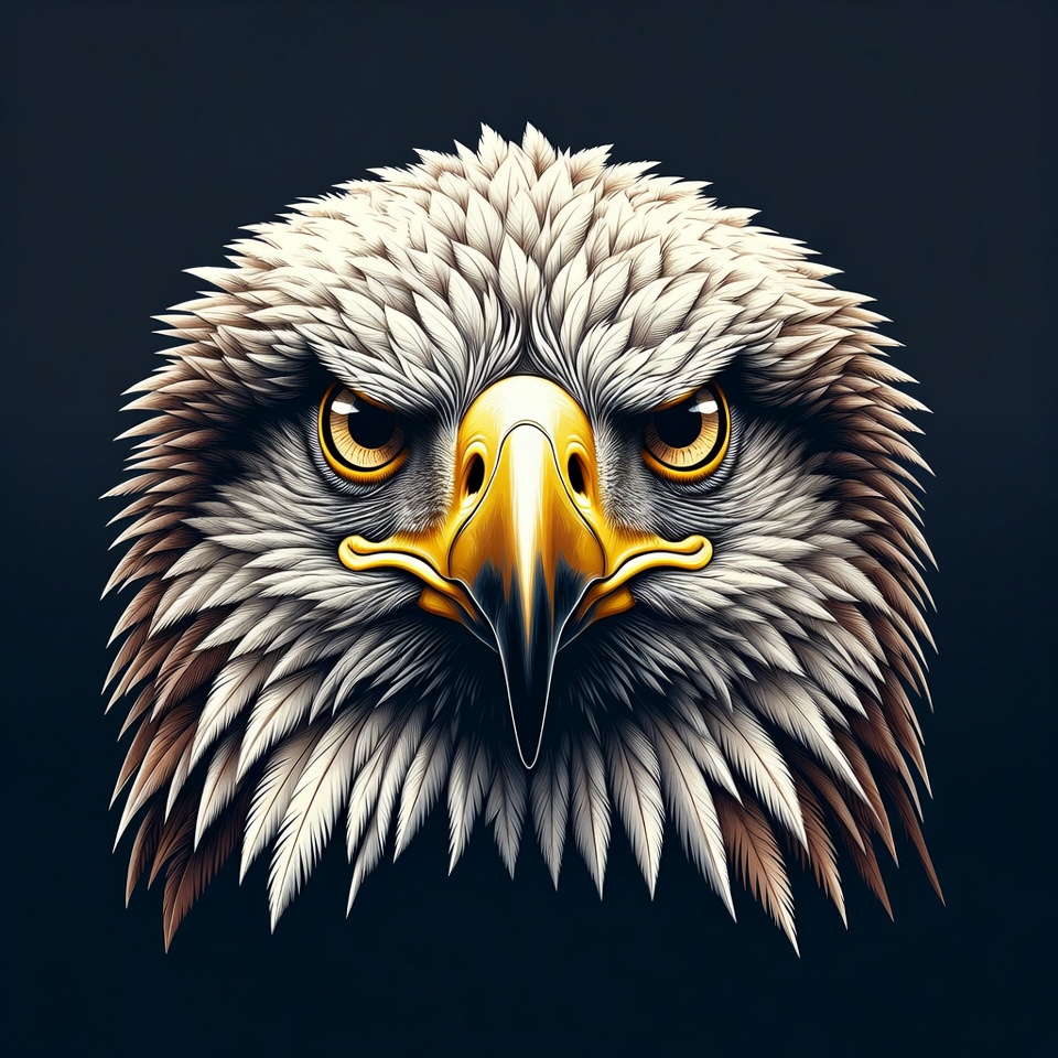 avian, bird, closeup, dark background, detailed, eagle, feathers, head, illustration, intense gaze, majestic, portrait, predatory bird, raptor, realistic, white feathers, wildlife, yellow beak, yellow eyes, bald eagle