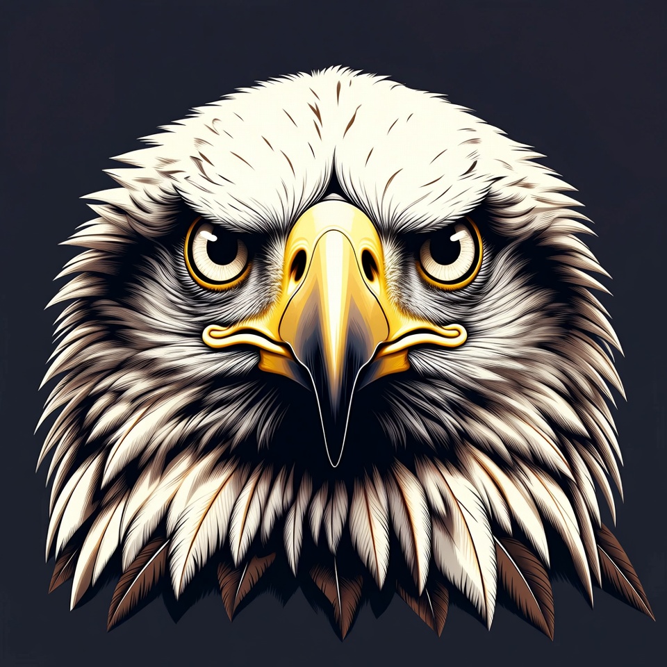 A detailed closeup portrait of a bald eagle's face against a dark background. The eagle features white feathers on its head, a bright yellow beak, and intense yellow eyes with a fierce expression. Fine feather details are highlighted in a realistic digital illustration style.