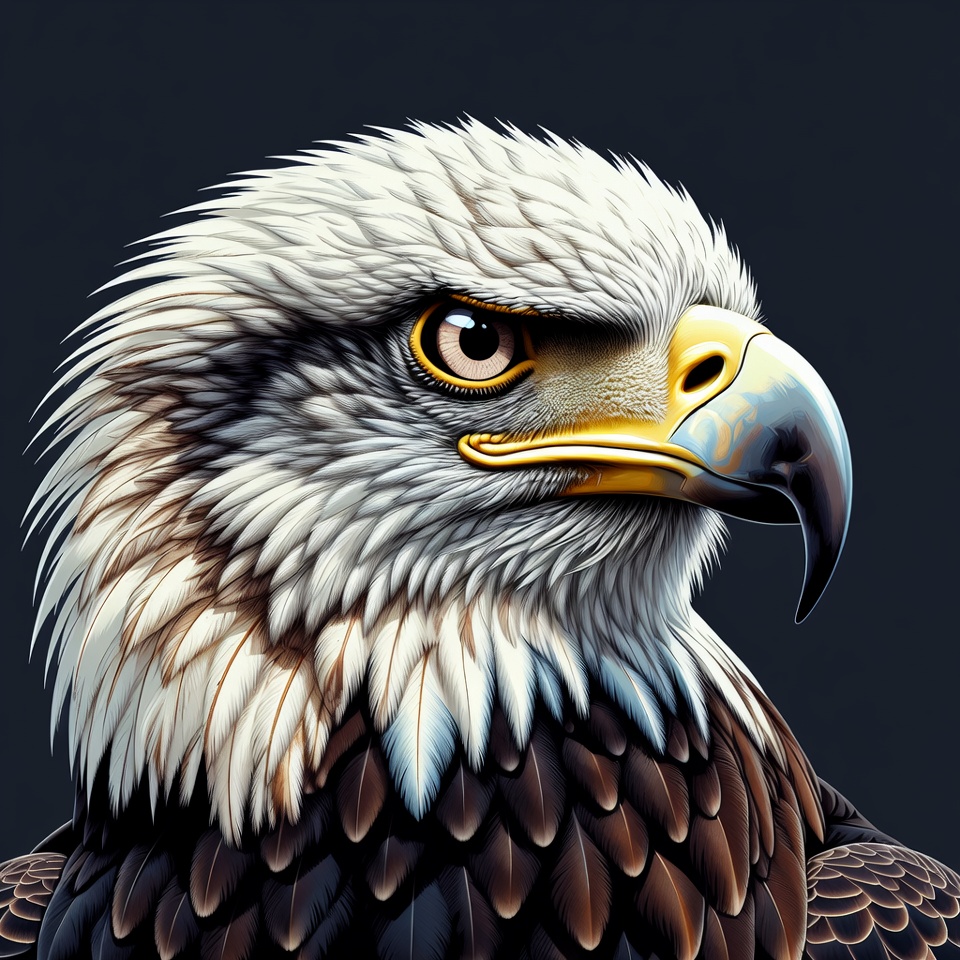 animal, bird, close-up, dark feathers, eagle, feathers, illustration, intense gaze, isolated background, portrait, raptor, sharp beak, white feathers, wildlife, yellow eyes, bald eagle