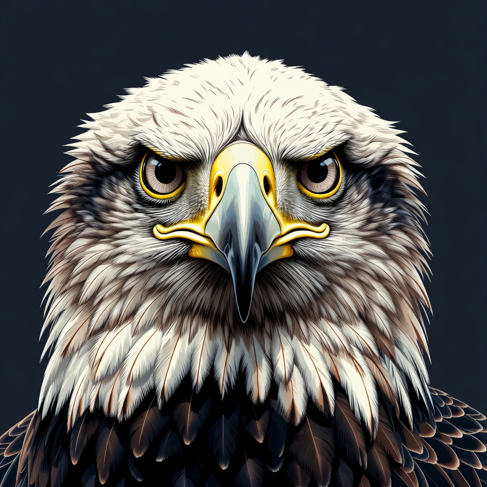 bird, close-up, dark background, eagle, feathers, head, illustration, intense stare, isolated background, portrait, predatory bird, raptor, sharp gaze, white feathers, wildlife, yellow beak, yellow eyes, bald eagle